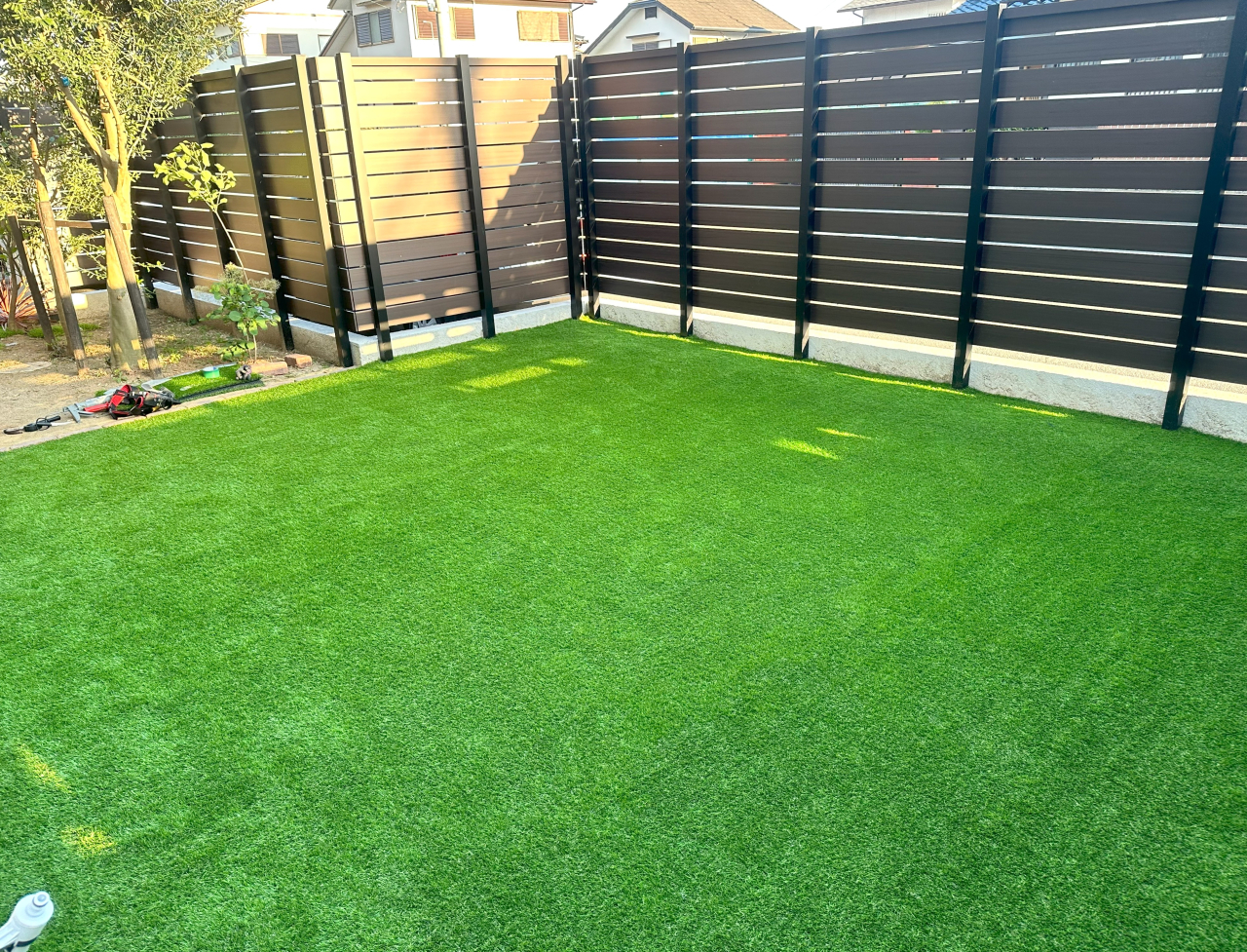 お庭全体の雑草処理後、整地・転圧、防草シートと人工芝を施工致しました。これから雑草処理からも解放される!と大変お喜び頂けました。またデラックス芝丈28mmの品質にも大変ご満足いただけました。この度は、誠にありがとうございました。