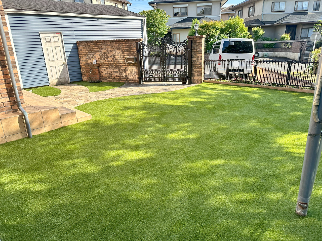 お庭全体の清掃後、既存の防草シートの上に人工芝を施工させていただきました。お庭一面緑に包まれ、お庭だけではなくお家全体の雰囲気も明るくなりました。仕上がりにも大変お喜びいただけました。この度は誠にありがとうございました。