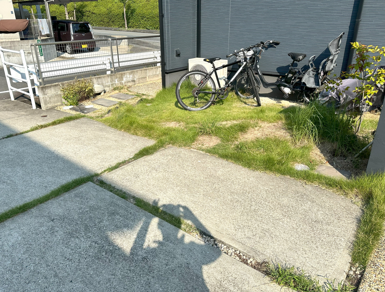 お庭全体に雑草が生い茂っておりました。雑草のお手入れが大変なことから、人工芝をご検討くださいました。ご自宅の周り全体の工事をご希望されていた為、できるだけ費用を抑えたいとのことでしたので、今回は弊社で人気の高いコスパNo,1のAタイプ芝丈30mmをお勧めさせていただきました。