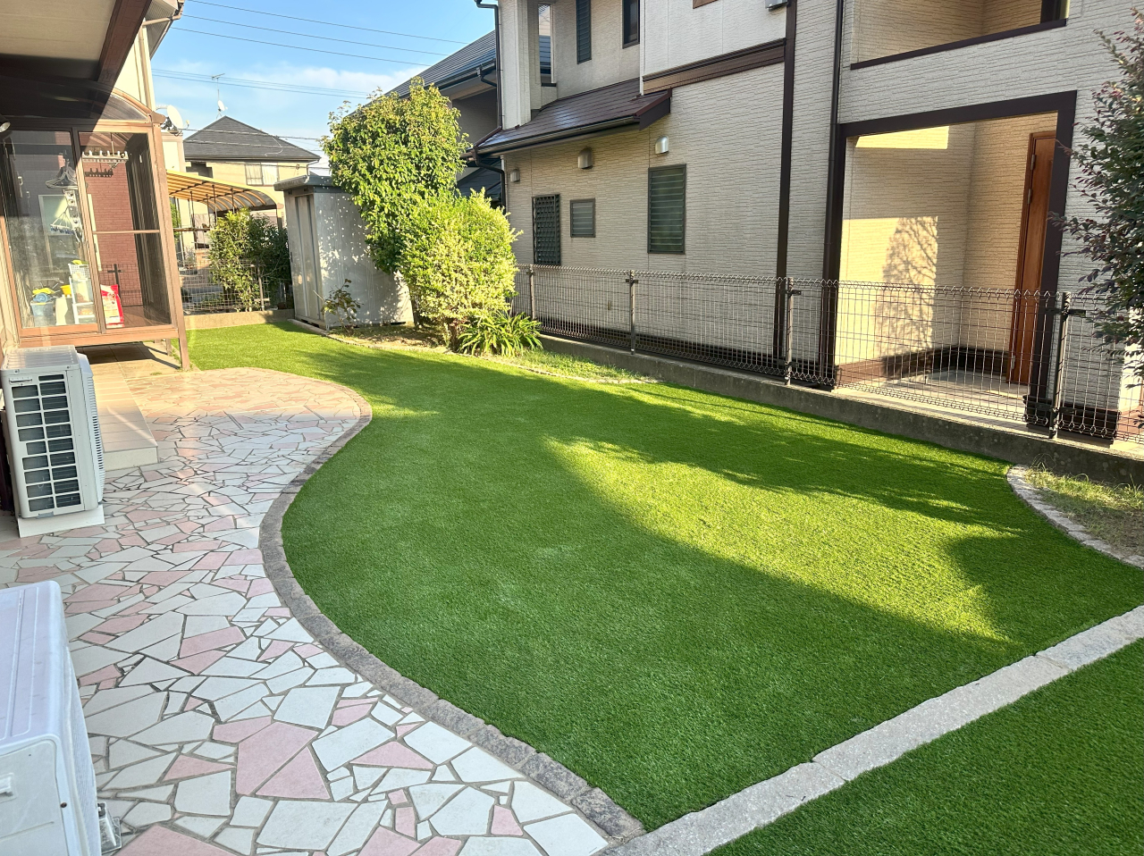 お庭全体の天然芝処理後、不陸修正を行い、防草シートと人工芝を施工いたしました。既存のアプローチとの相性も抜群で、とてもオシャレなお庭へと変わりました。「これならお掃除もしやすい!」と大変お喜びいただけました。この度は誠にありがとうございました。