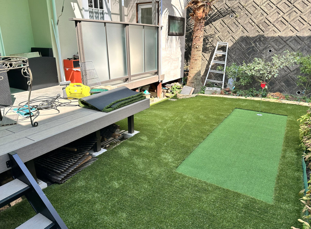 お庭には多数の雑草が生えており、お手入れに大変お困りのご様子でした。人工芝を導入するにあたり、ご主人様のご趣味であるゴルフスペースの設置もご希望でした。入念に打ち合わせをさせていただき、この度ご依頼いただきました。