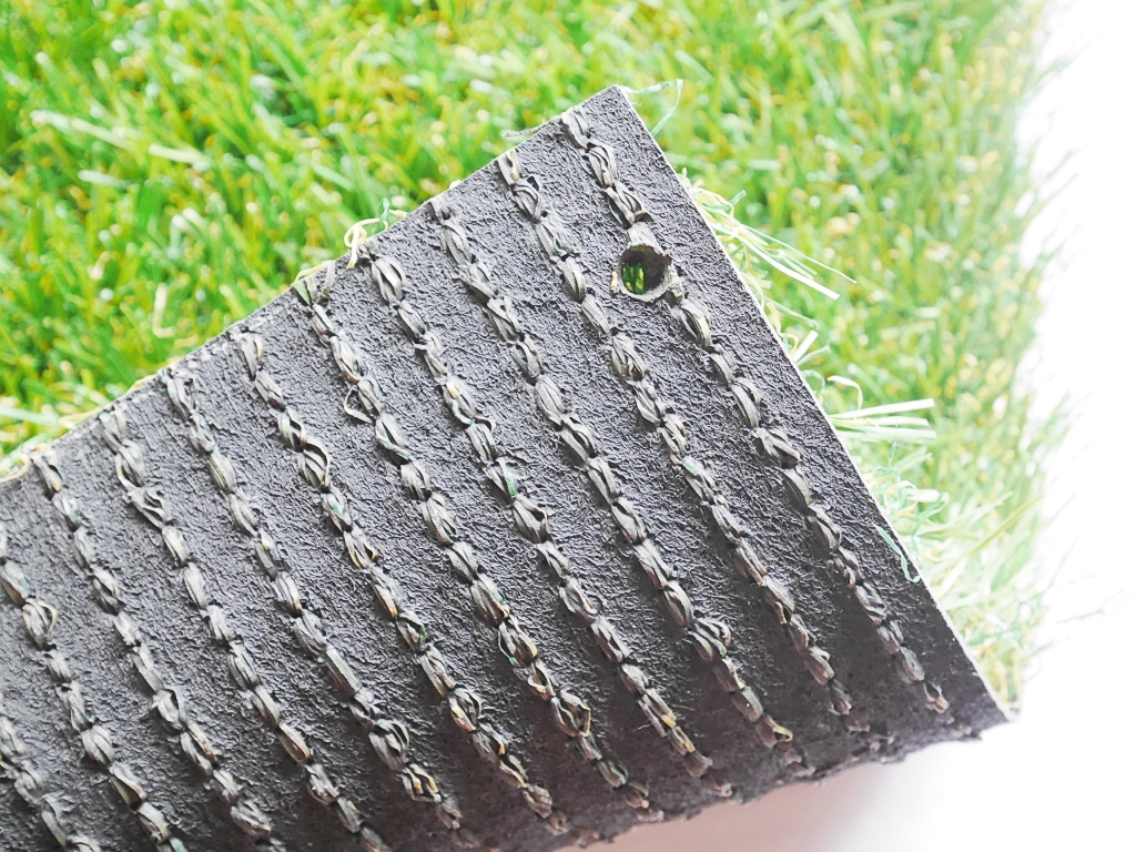 芝糸は2種類使用。緑の長い芝糸とベージュの短い芝糸を交ぜております。緑の長い芝糸は微妙に色合いが違う芝糸をいくつか使用しているので、自然な色合いに見えます。ベージュの短い芝糸は枯れ草のような役割を担い、より芝全体のリアルな見た目を実現します。芝糸2種類ともにポリエチレン素材の為、充填剤無しでもクッション性や直立性に優れており、柔らかく自然な肌触りです。