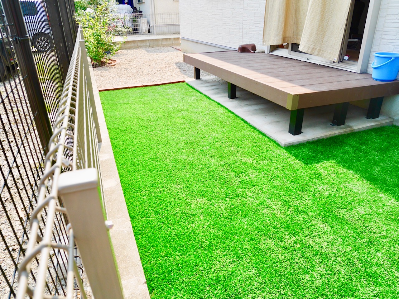 今回は既存の防草シートをそのまま活かし、人工芝を施工いたしました。小さなお子様でも裸足で走り回って遊べるお庭にチェンジ!!ふわふわの肌触りに大変お喜びいただけました。