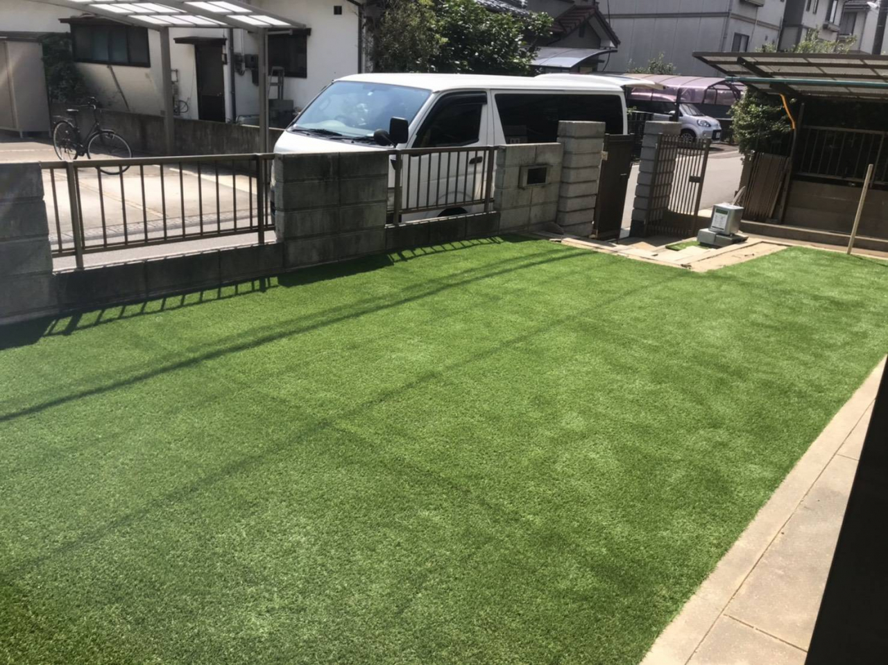 お庭全体の雑草処理後、砂を追加して不陸を調整し、防草シートと人工芝を施工致しました。完成後、綺麗になったお庭を見て大変お喜びいただけました。もっと早くに人工芝にしていれば良かったととても嬉しいお言葉を頂戴いたしました。人工芝の色味も家の和の雰囲気に馴染んでおりました。この度は誠にありがとうございました。