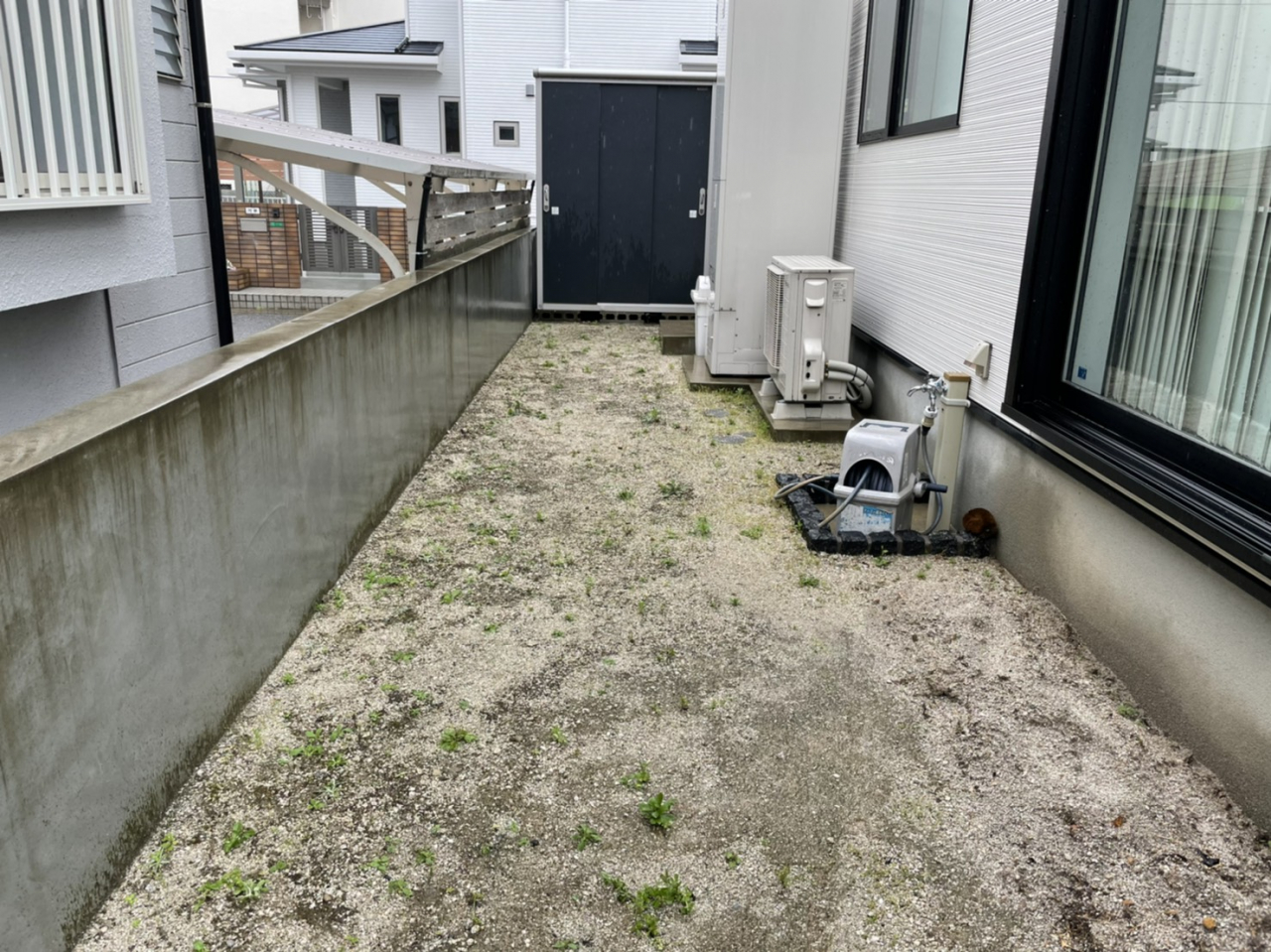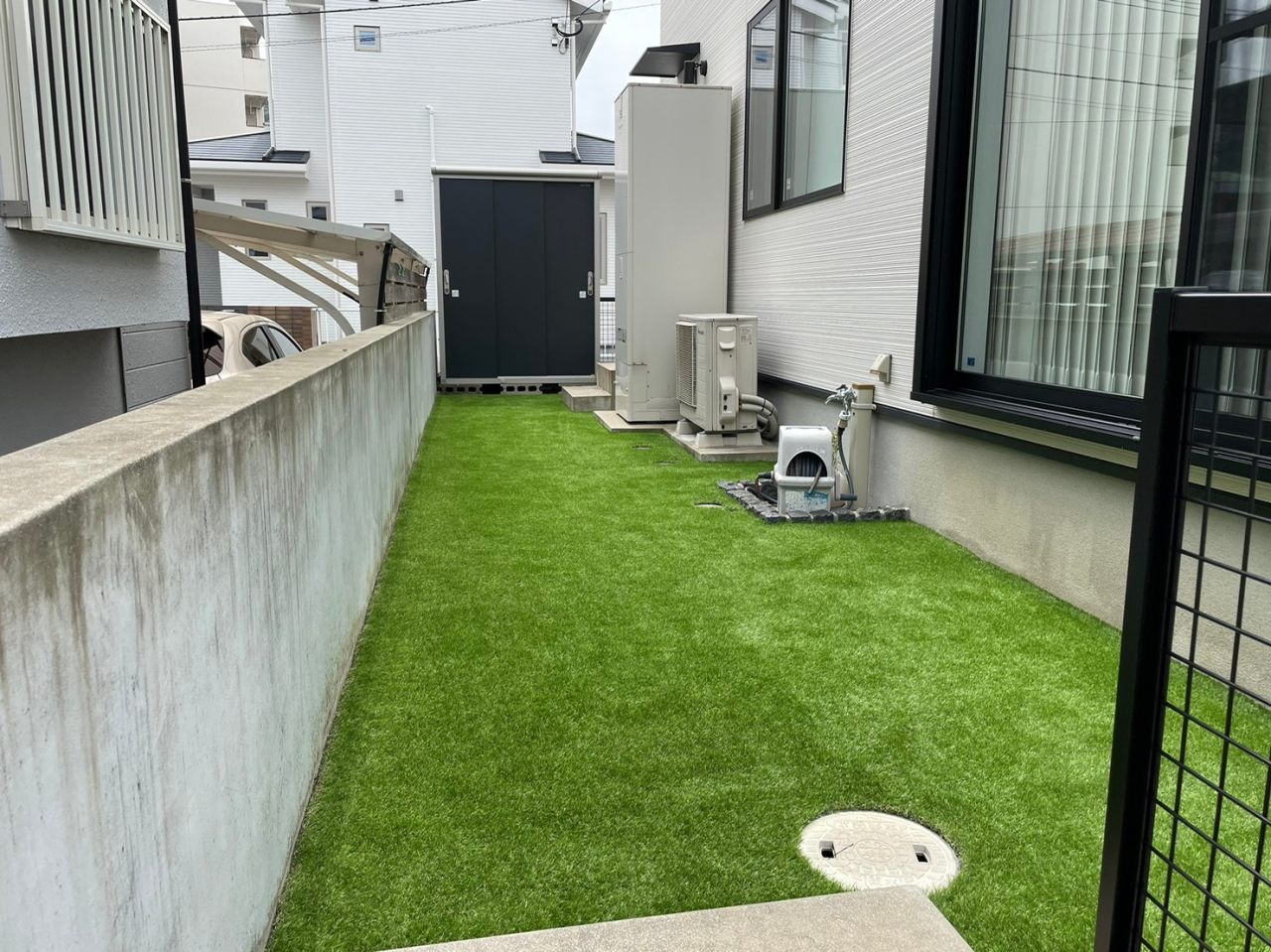 新築でご購入されましたお家の裏手に人工芝をご検討されておりました。裏手はよく表からも見える位置にあり、景観を気にされておりました。またお子様も小さく、今後お子様が安心して遊べるようなスペースにもしたいとのご希望もあり、この度、人工芝の導入をご決断されました。