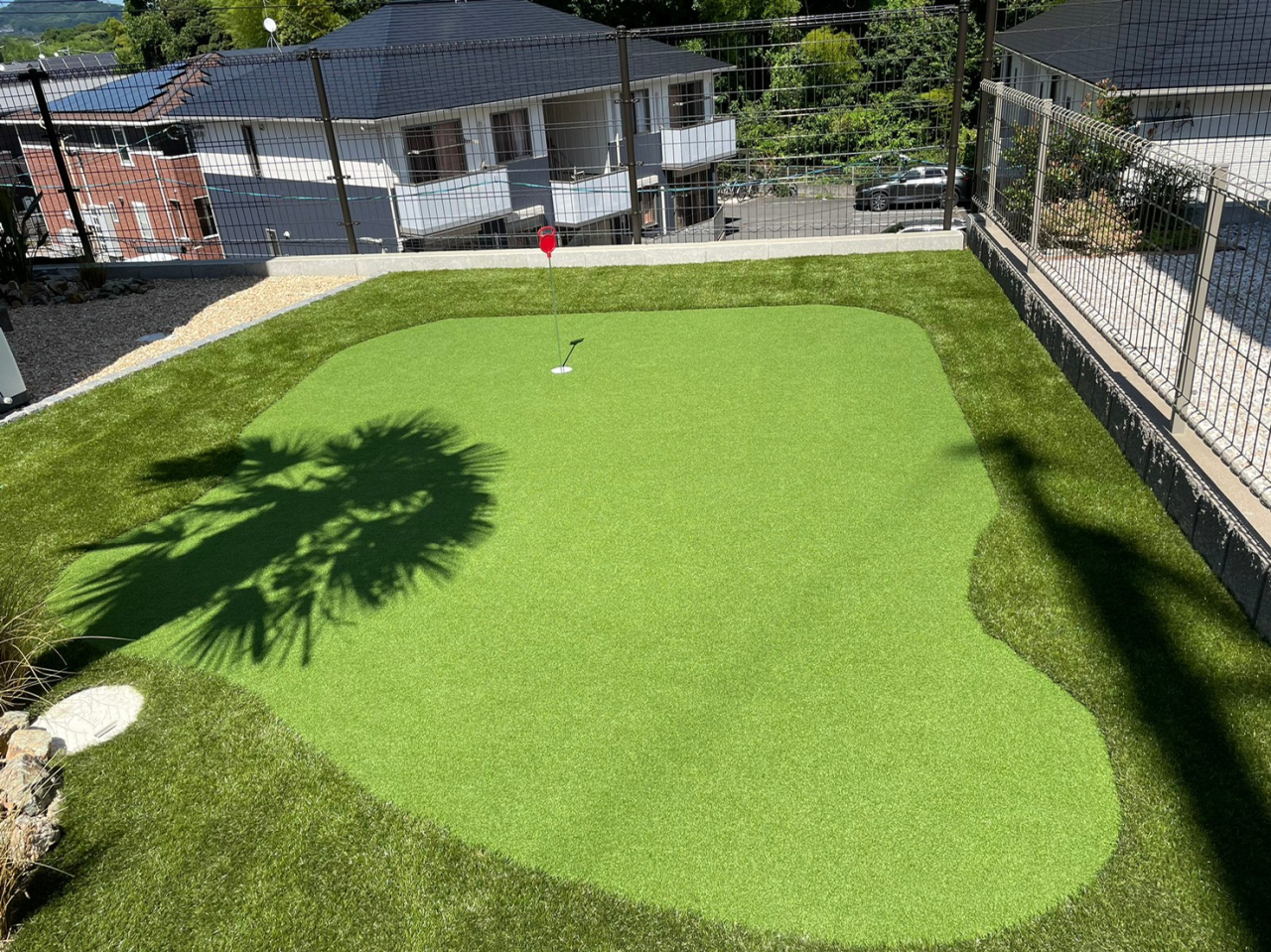 お庭全体の雑草処理後、不陸調整を行い、お庭全体に防草シートと人工芝を施工致しました。お庭全体で楽しめるパターグリーンはとても贅沢な空間でした。お客様にも大変お喜び頂けました。これからは、思いっきりゴルフを楽しんで頂きたいと思います。この度は誠にありがとうございました。