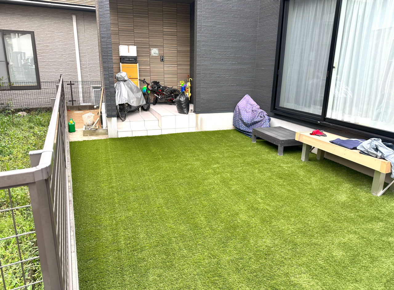 お庭全体の清掃後、人工芝を接着施工いたしました。お家周りに関しては雑草処理後、不陸を調整し、防草シートと人工芝を施工致しました。家横の細い部分にも綺麗に人工芝を敷きこみました。緑色一面の綺麗な景観にとてもお喜びいただき、細かいところまで綺麗です!と大変嬉しいお言葉もいただきました。この度は誠に有難うございました。