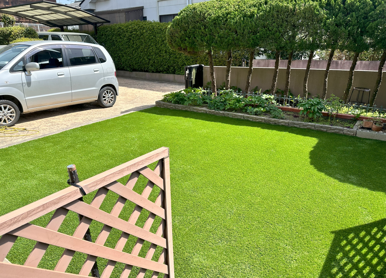 お庭全体の雑草・天然芝を処理、砂を追加して整地・転圧後、防草シートと人工芝を施工致しました。ずっと手間だったお手入れからやっと解放されると大変お喜び頂けました。また、Aタイプ芝丈30mmの色味についても「とっても綺麗です!」とお褒めいただきました。この度は誠にありがとうございました。