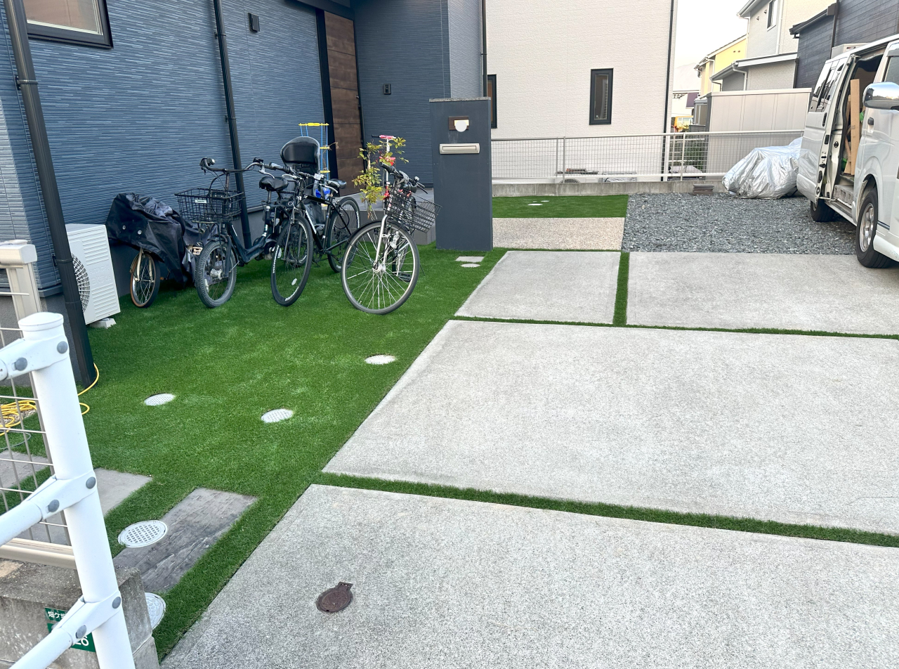 お庭全体の雑草処理後、不陸を調整し、防草シートと人工芝を施工致しました。雑草が生い茂っていたお庭も、緑一面の綺麗な景観になりました。Aタイプ芝丈30mmの色味や質感にも大変ご満足いただけました。この度は、誠にありがとうございました。